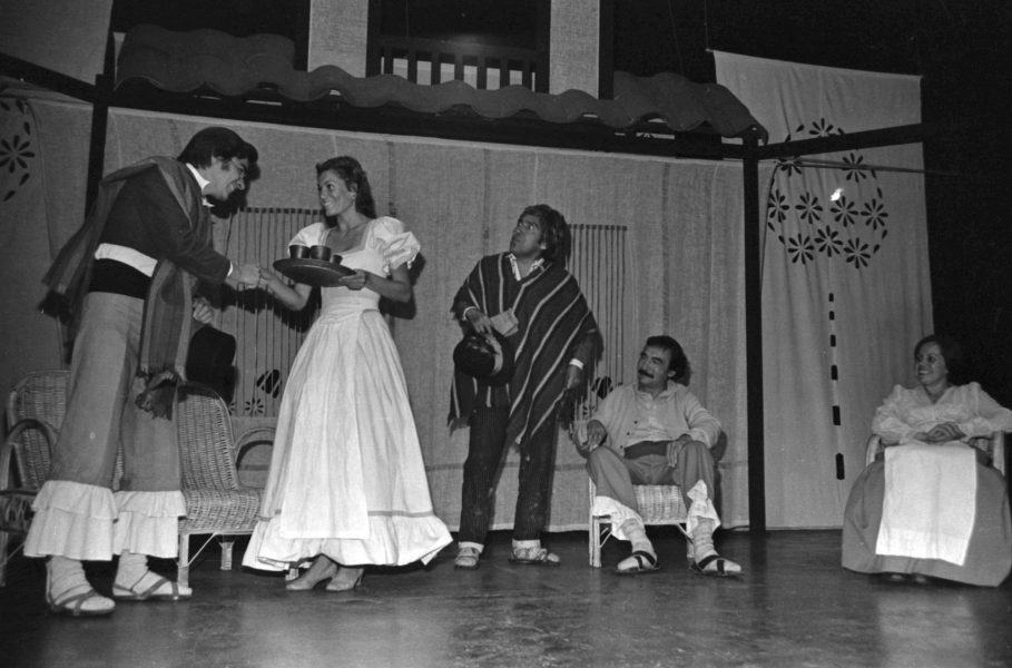 De izquierda a derecha los actores Osvaldo Lagos, Coca Guazzini, Juan Quezada, Mario Montilles y Gabriela Medina. El sobre que almacenaba este negativo aparece fechado en 1976, sin embargo es posible que la fecha real sea 1975, correspondiente al año de estreno del montaje.
