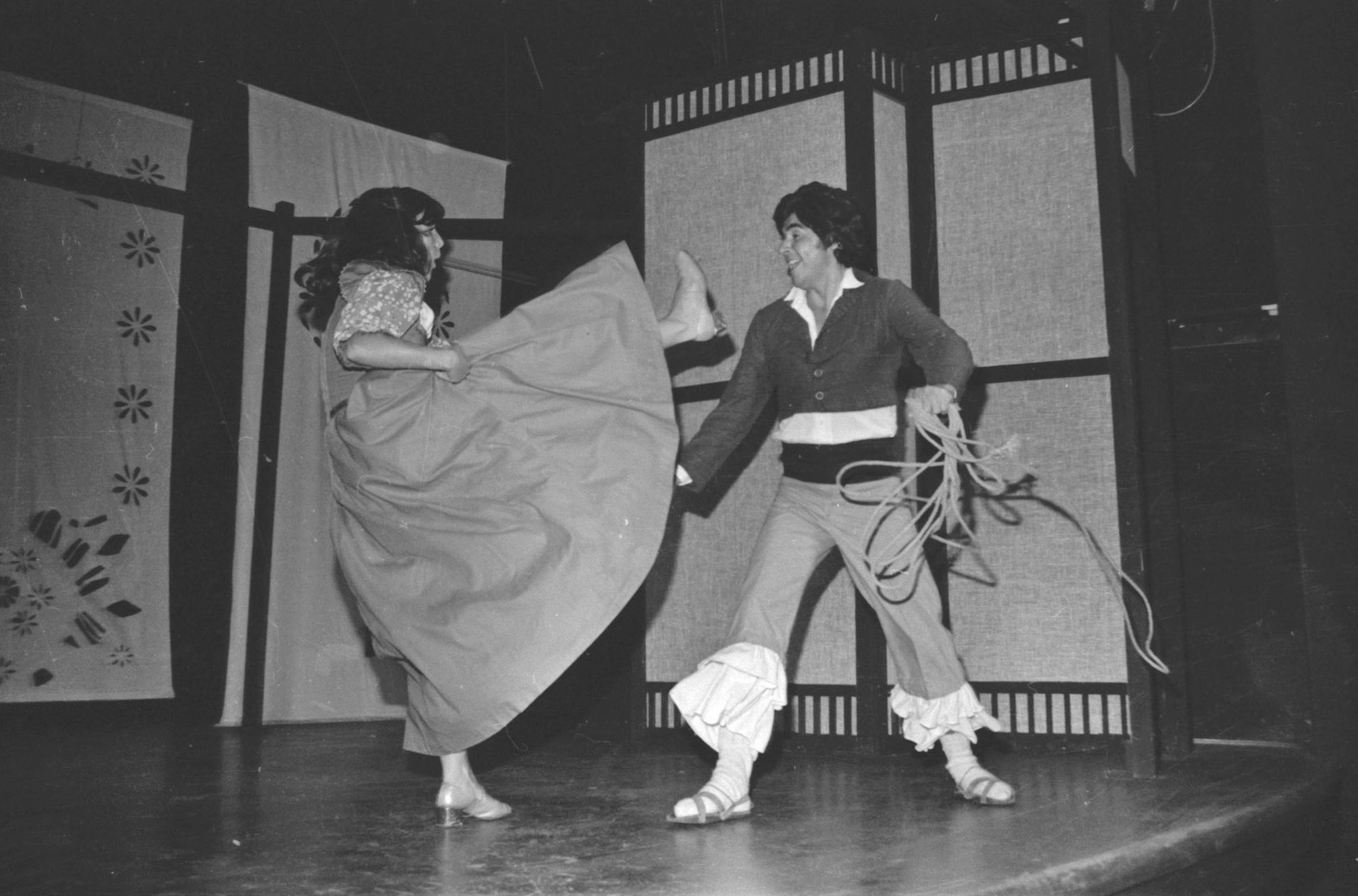 En la imagen se observa a Osvaldo Lagos, interpretando a Perucho y Carolina Benitez a Catalina, pretendida por Perucho. El sobre que almacenaba este negativo aparece fechado en 1976, sin embargo es posible que la fecha real sea 1975, correspondiente al año de estreno del montaje.