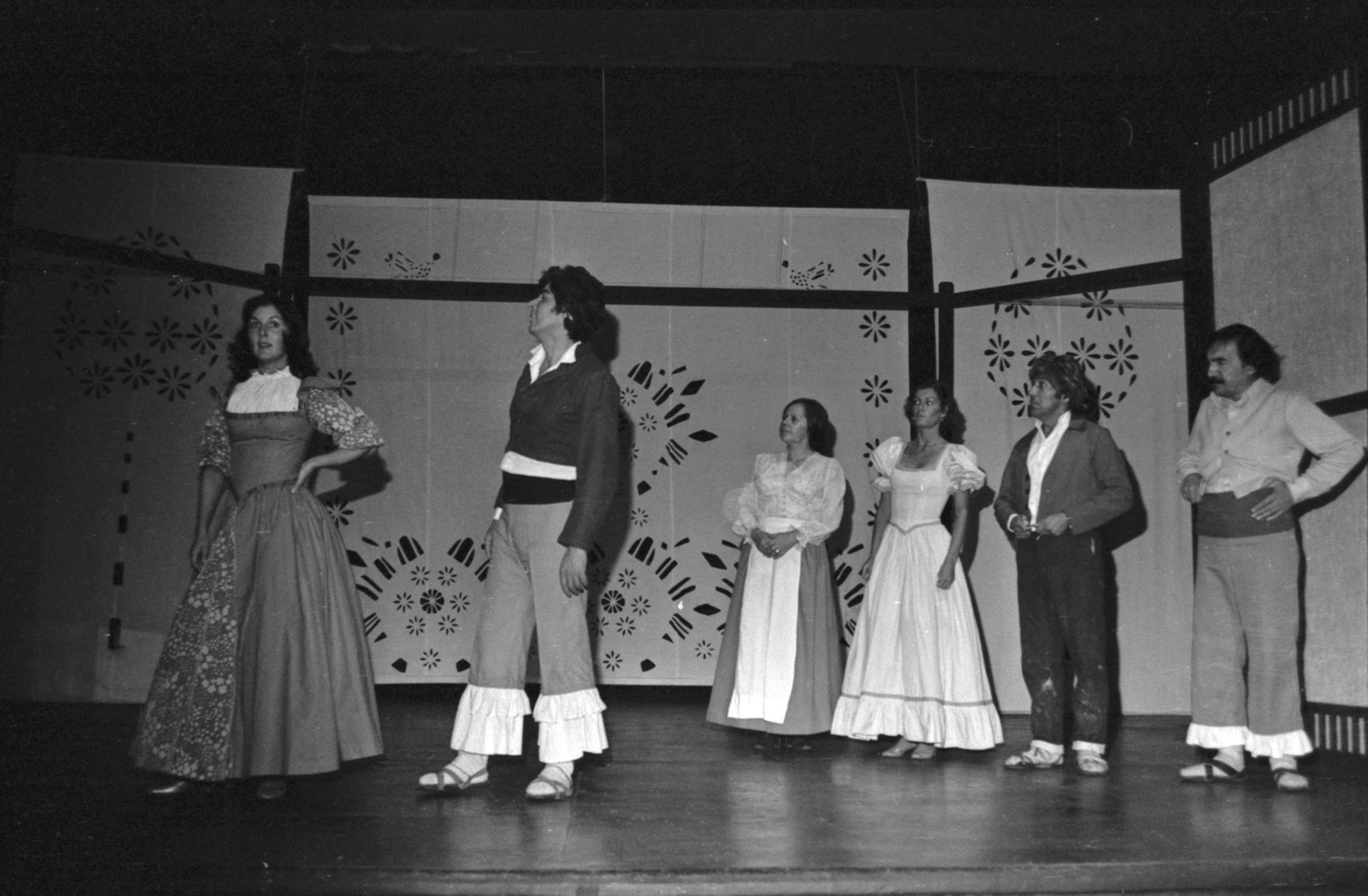 En la foto se observa a Carolina Benitez, Osvaldo Lagos, Gabriela Medina, Coca Guazzini, Juan Quezada y Mario Montilles. El sobre que almacenaba este negativo aparece fechado en 1976, sin embargo es posible que la fecha real sea 1975, correspondiente al año de estreno del montaje.