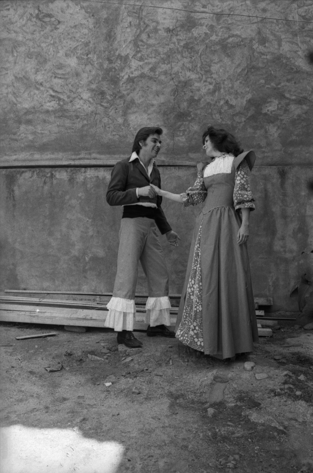 En la imagen se aprecia al actor Osvaldo Lagos y Carolina Benitez en sesión fotográfica promocional de "La Fierecilla Domada". El sobre que almacenaba este negativo aparece fechado en 1976, sin embargo es posible que la fecha real sea 1975, correspondiente al año de estreno del montaje.