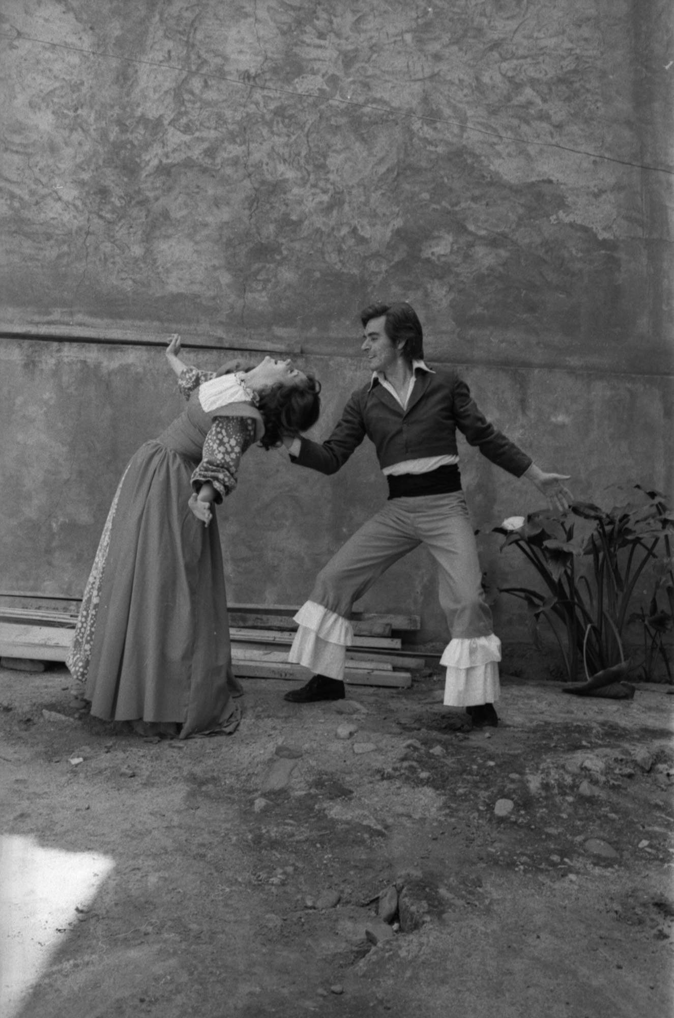 En la imagen se aprecia al actor Osvaldo Lagos y Carolina Benitez en sesión fotográfica promocional de "La Fierecilla Domada". El sobre que almacenaba este negativo aparece fechado en 1976, sin embargo es posible que la fecha real sea 1975, correspondiente al año de estreno del montaje.