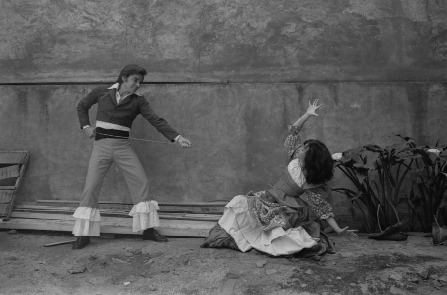 En la imagen se aprecia al actor Osvaldo Lagos y Carolina Benitez en sesión fotográfica promocional de "La Fierecilla Domada". El sobre que almacenaba este negativo aparece fechado en 1976, sin embargo es posible que la fecha real sea 1975, correspondiente al año de estreno del montaje.