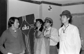 Elenco que interpretó la versión chilena de Luis Soto Ramos de "La Fierecilla Domada". El montaje, que cuenta con dos actos, fue dirigido por Gustavo Meza y musicalizado por Patricio Solovera. El sobre que almacenaba este negativo aparece fechado en 1976, sin embargo, es posible que la fecha real sea 1975, correspondiente al año de estreno del montaje.