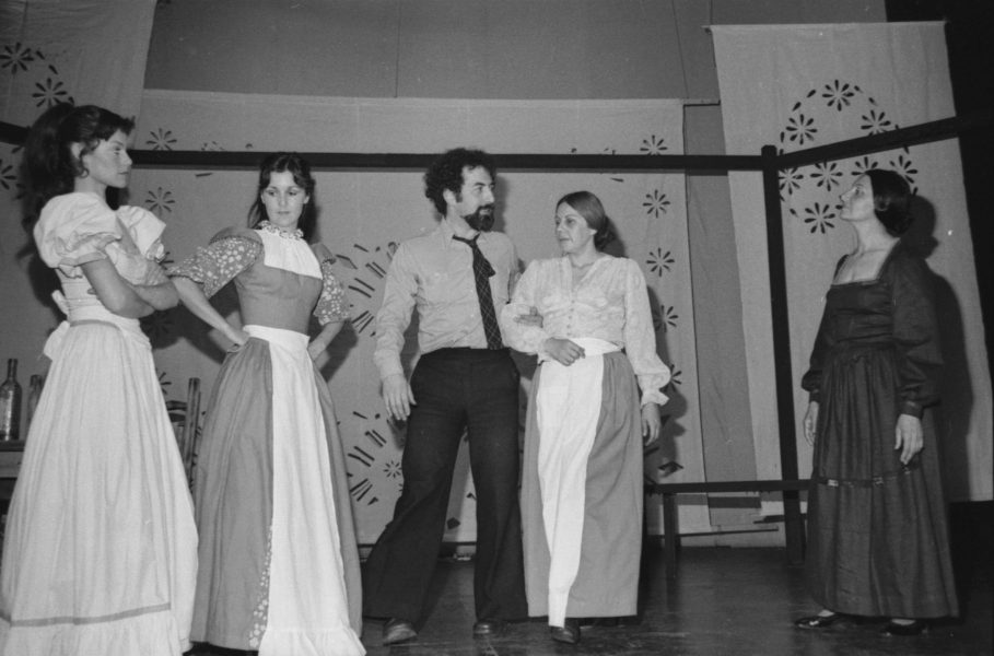 En la imagen se observa al director Gustavo Meza junto Coca Guazzini, Carolina Benitez, Gabriela Medina y Maité Fernández ensayando "La Fierecilla Domada". El sobre que almacenaba este negativo aparece fechado en 1976, sin embargo es posible que la fecha real sea 1975, correspondiente al año de estreno del montaje.