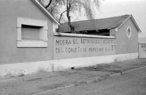 Vicerrector de Extensión y Comunicaciones Roberto Escobar y el periodista y miembro del Consejo Asesor de la Editorial Nacional Gabriela Mistral (ex Editorial Quimantú) Thomas McHale. Si bien el sobre que contenía la fotografía no tiene fecha, el discurso pronunciado por Thomas McHale titulado "Imperativo de la Educación Chilena" y que es parte de la colección de la Biblioteca Nacional, está fechado en 1976.