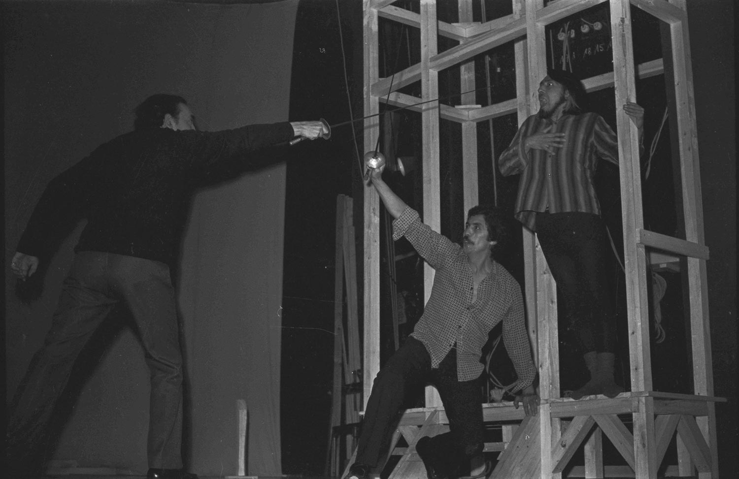 Ensayo de la obra "La viuda astuta" de Carlo Goldoni, comedia en tres actos, que fue estrenada en la temporada teatral de 1975. En la imagen, Mario Montilles, Adriano Castillo y Juan Quezada.