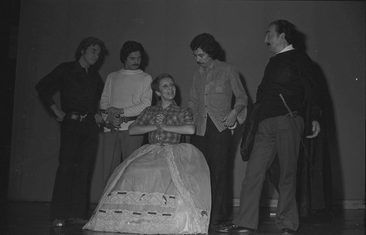 Ensayo de la obra "La viuda astuta" de Carlo Goldoni, comedia en tres actos, que fue estrenada en la temporada teatral de 1975. En la imagen, Osvaldo Lagos,Patricio Villanueva, Gladys del Río, Adriano y Mario Montilles.