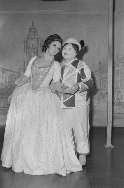 Gladys del Río y Jorge Boudon en escena de la comedia "La viuda astuta" de Carlo Goldoni, estrenada en la temporada teatral de 1975.