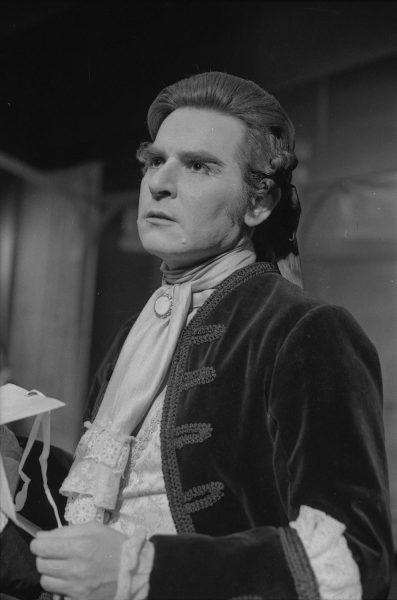 Osvaldo Lagos en escena de la comedia "La viuda astuta" de Carlo Goldoni, estrenada en la temporada teatral de 1975.