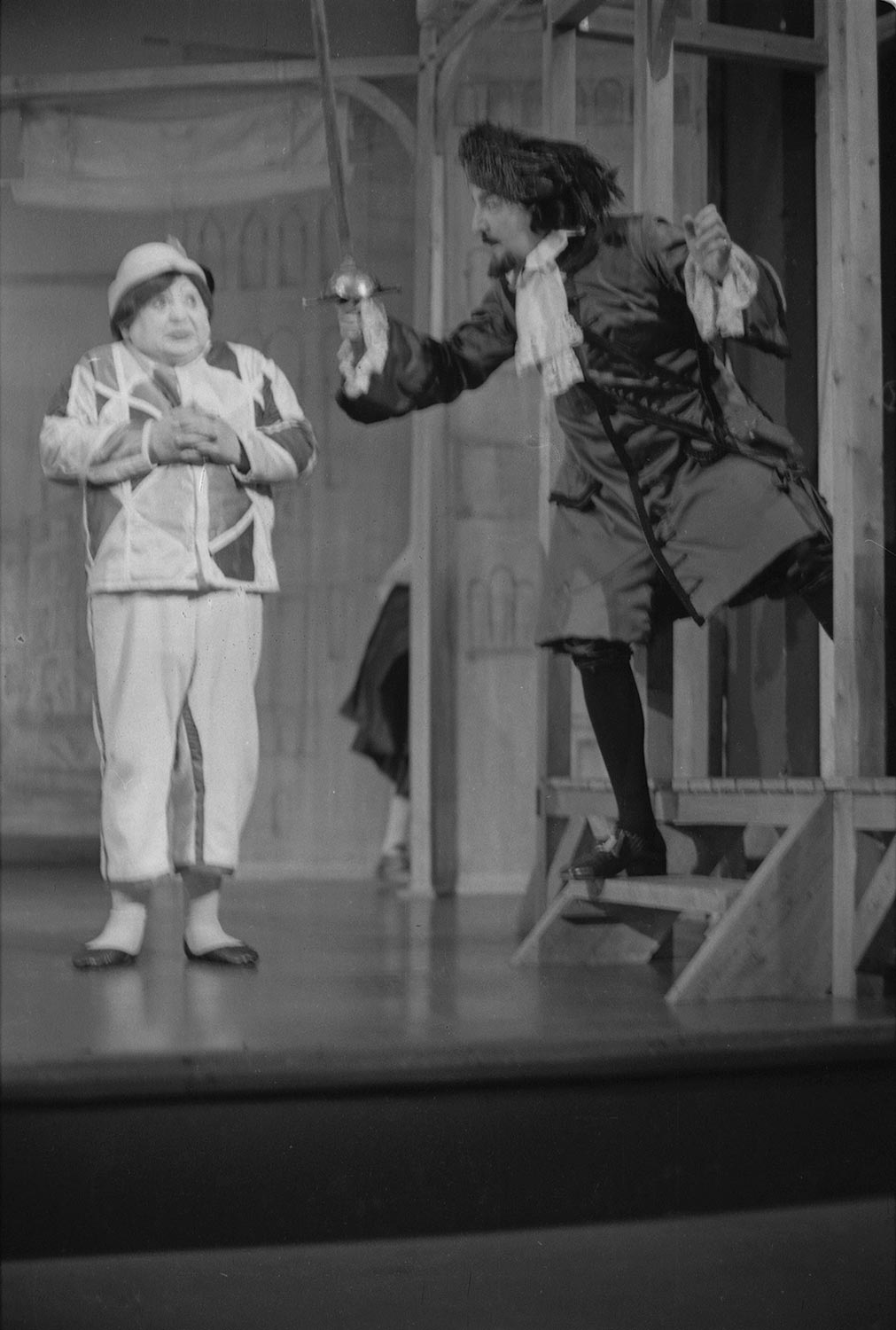 Jorge Boudon y Mario Montilles en escena de la comedia "La viuda astuta" de Carlo Goldoni . Esta obra fue estrenada por el Teatro Teknos en la temporada teatral de 1975.