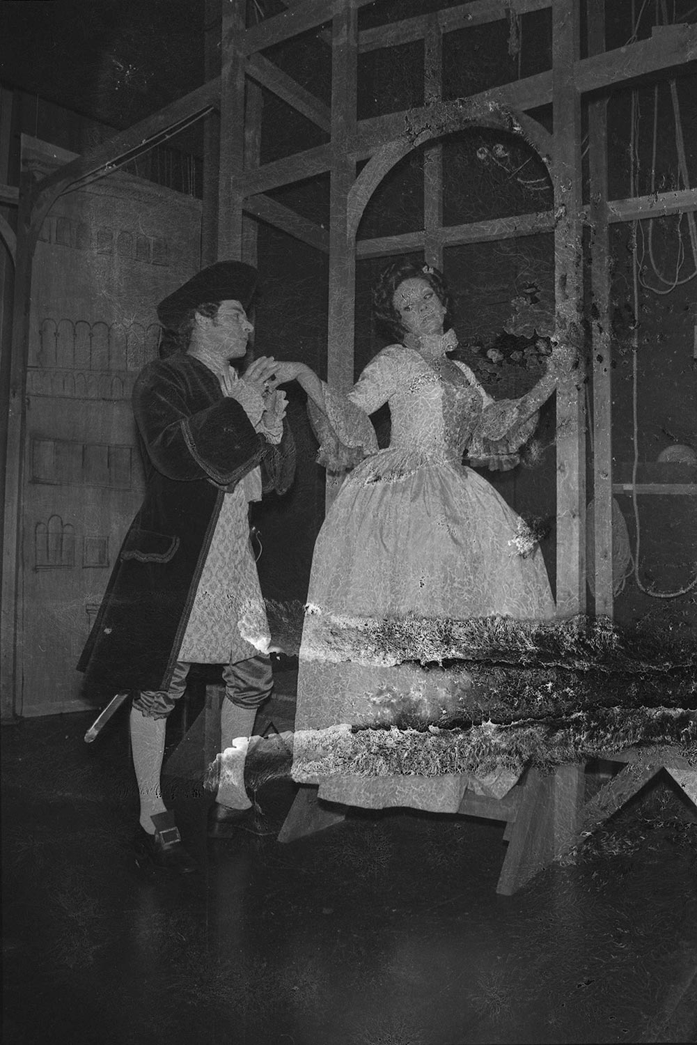 Gladys del Río y Osvaldo Lagos en escena de "La viuda astuta" de Carlo Goldoni. Esta obra se estrenó en la temporada teatral de 1975.