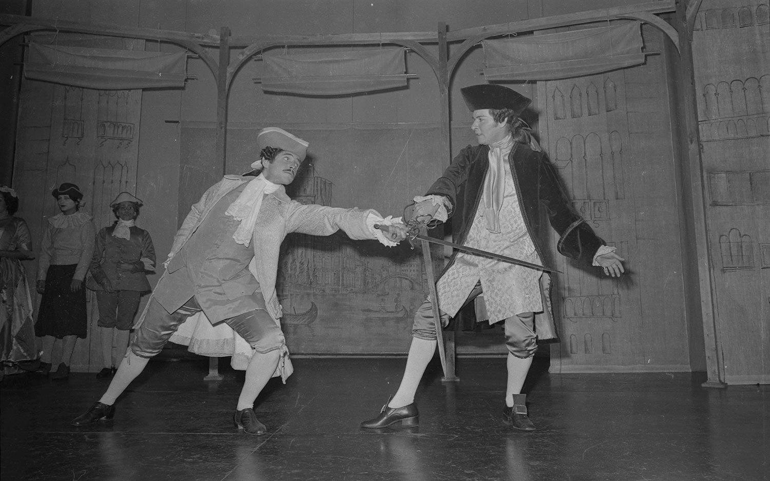 Patricio Villanueva y Osvaldo Lagos en escena de la comedia "La viuda astuta" de Carlo Goldoni, estrenada por el Teatro Teknos en 1975.