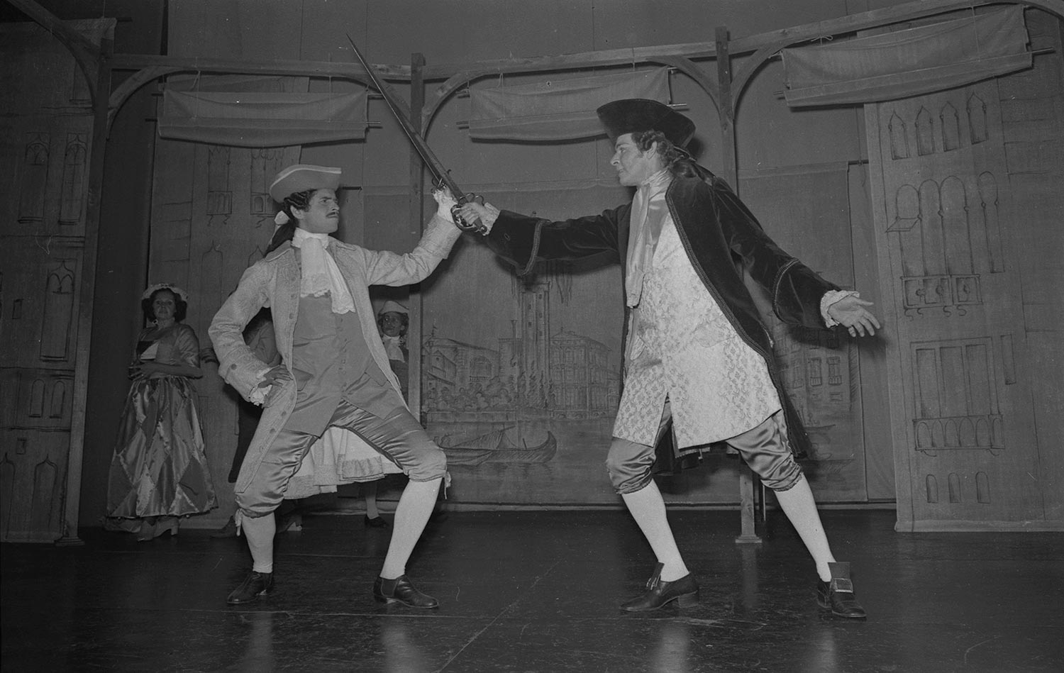 Escena de la obra "La viuda astuta" de Carlo Goldoni, estrenada por el Teatro Teknos en 1975. Al fondo, se aprecia a Gabriela Medina, y en primer plano, a los actores Patricio Villanueva y Osvaldo Lagos.