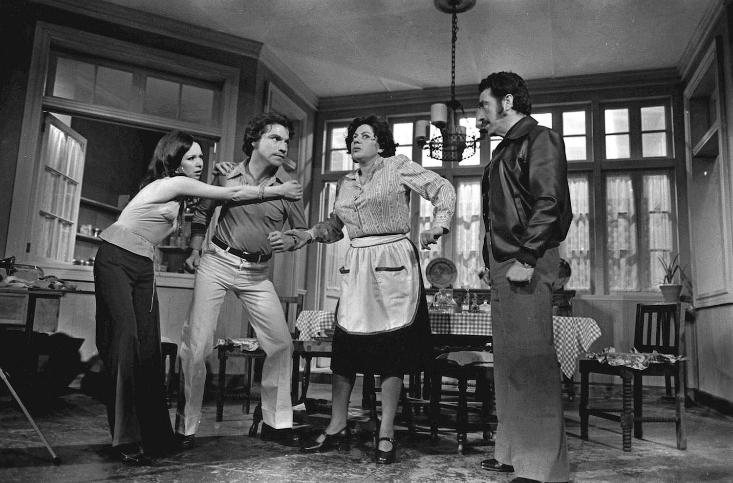 Clara María Escobar, Nelson Báez, Gabriela Medina y Frankie Bravo en ensayo de La familia de Marta Mardones, obra de Fernando Cuadra. Este montaje, dirigido por Pedro Mortheiru, fue el último realizado por el Teknos antes de su cierre por orden del Vicerrector Roberto Escobar. Su última función fue realizada en mayo de 1977.