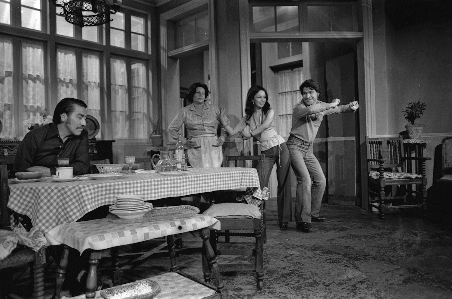 Juan Quezada, Gabriela Medina, Clara María Escobar y Nelson Báez en ensayo de La familia de Marta Mardones, obra de Fernando Cuadra. Este montaje, dirigido por Pedro Mortheiru, fue el último realizado por el Teknos antes de su cierre por orden del Vicerrector Roberto Escobar. Su última función fue realizada en mayo de 1977.