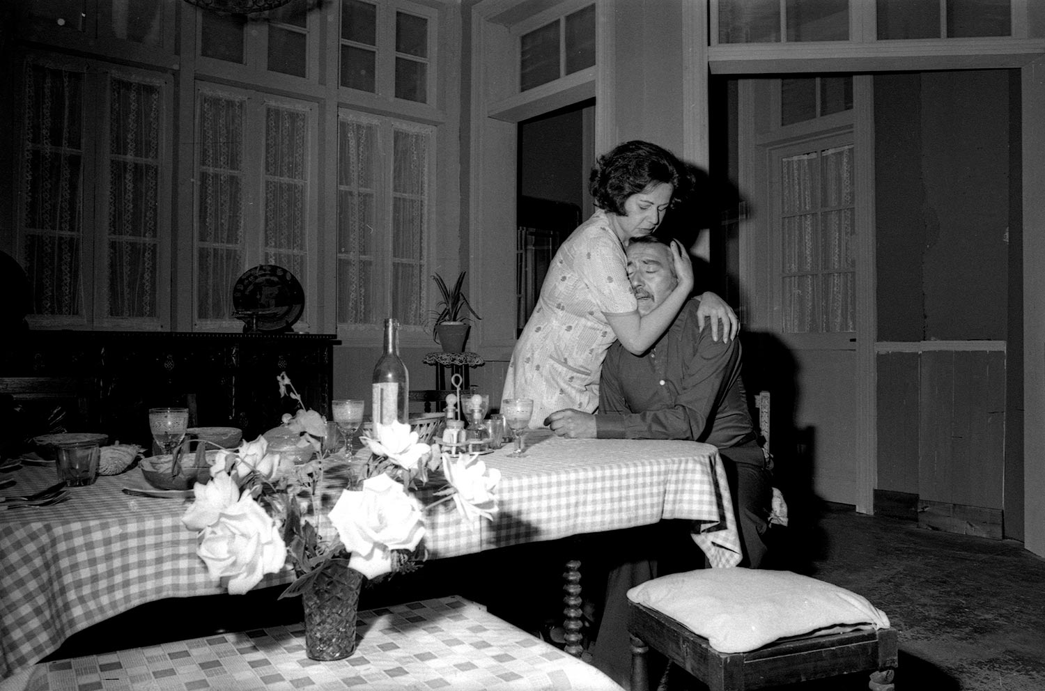 Gabriela Medina y Juan Quezada en ensayo de La familia de Marta Mardones, obra de Fernando Cuadra. Este montaje, dirigido por Pedro Mortheiru, fue el último realizado por el Teknos antes de su cierre por orden del Vicerrector Roberto Escobar. Su última función fue realizada en mayo de 1977.