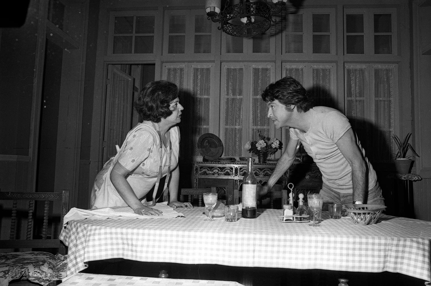 Gabriela Medina y Nelson Báez en ensayo de La familia de Marta Mardones, obra de Fernando Cuadra. Este montaje, dirigido por Pedro Mortheiru, fue el último realizado por el Teknos antes de su cierre por orden del Vicerrector Roberto Escobar. Su última función fue realizada en mayo de 1977.
