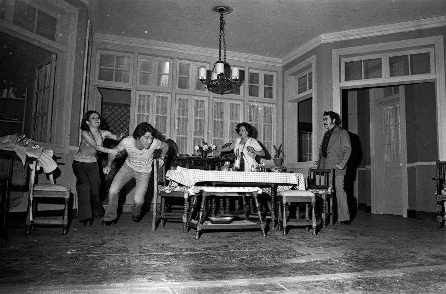 Clara María Escobar, Nelson Báez, Gabriela Medina y Frankie Bravo en ensayo de La familia de Marta Mardones, obra de Fernando Cuadra. Este montaje, dirigido por Pedro Mortheiru, fue el último realizado por el Teknos antes de su cierre por orden del Vicerrector Roberto Escobar. Su última función fue realizada en mayo de 1977.