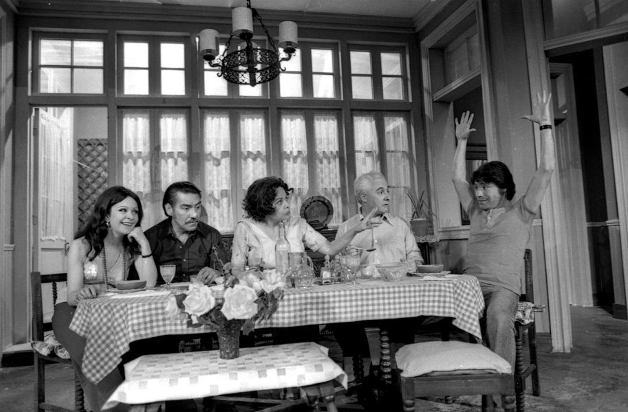 Clara María Escobar, Juan Quezada, Gabriela Medina, Enrique Madiña y Nelson Báez en ensayo de La familia de Marta Mardones, obra de Fernando Cuadra. Este montaje, dirigido por Pedro Mortheiru, fue el último realizado por el Teknos antes de su cierre por orden del Vicerrector Roberto Escobar. Su última función fue realizada en mayo de 1977.
