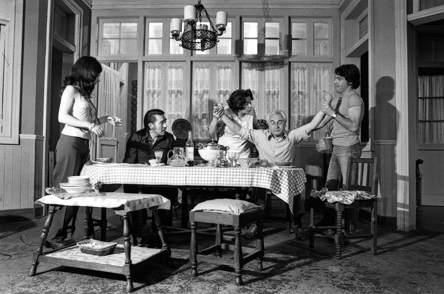 Juan Quezada, Clara María Escobar, Gabriela Medina, Enrique Madiña y Nelson Báez en ensayo de La familia de Marta Mardones, obra de Fernando Cuadra. Este montaje, dirigido por Pedro Mortheiru, fue el último realizado por el Teknos antes de su cierre por orden del Vicerrector Roberto Escobar. Su última función fue realizada en mayo de 1977.