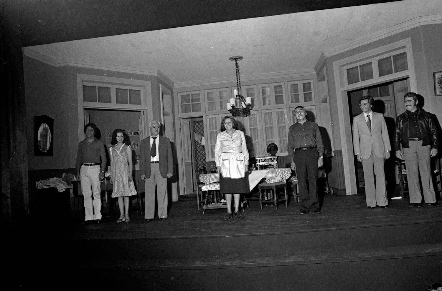 Elenco de la obra La Familia de Marta Mardones, de izquierda a derecha: Nelson Báez, Clara María Escobar, Enrique Madiña, Gabriela medina, Juan Quezada, Osvaldo Lagos y Frankie Bravo. Esta obra de Fernando Cuadra, fue dirigida por Pedro Mortheiru, y fue el último montaje del Teatro Teknos antes de la orden de cierre en 1976 por parte del Vicerrector Roberto Escobar. Su última función fue realizada en mayo de 1977.