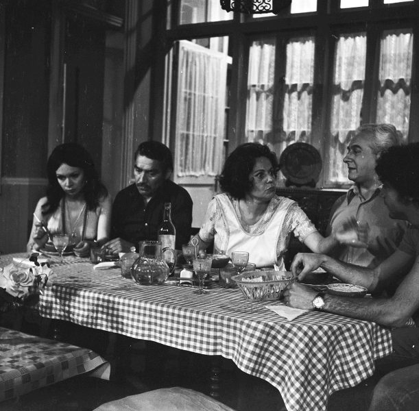 Clara María Escobar, Juan Quezada, Gabriela Medina, Enrique Madiña y Nelson Báez en escena de La familia de Marta Mardones. Esta obra de Fernando Cuadra fue la última estrenada por el Teatro Teknos antes de su cierre en 1976 por orden del vicerrector Roberto Escobar. Su última función fue realizada en mayo de 1977.