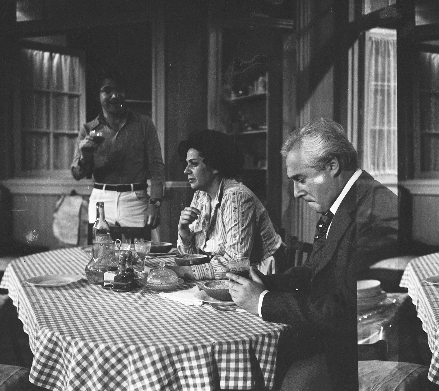 Nelson Báez, Gabriela Medina y Enrique Madiña en escena de La familia de Marta Mardones de Fernando Cuadra. Esta obra fue la última estrenada por el Teatro Teknos antes de su cierre en 1976 por orden del vicerrector Roberto Escobar. Su última función fue realizada en mayo de 1977.