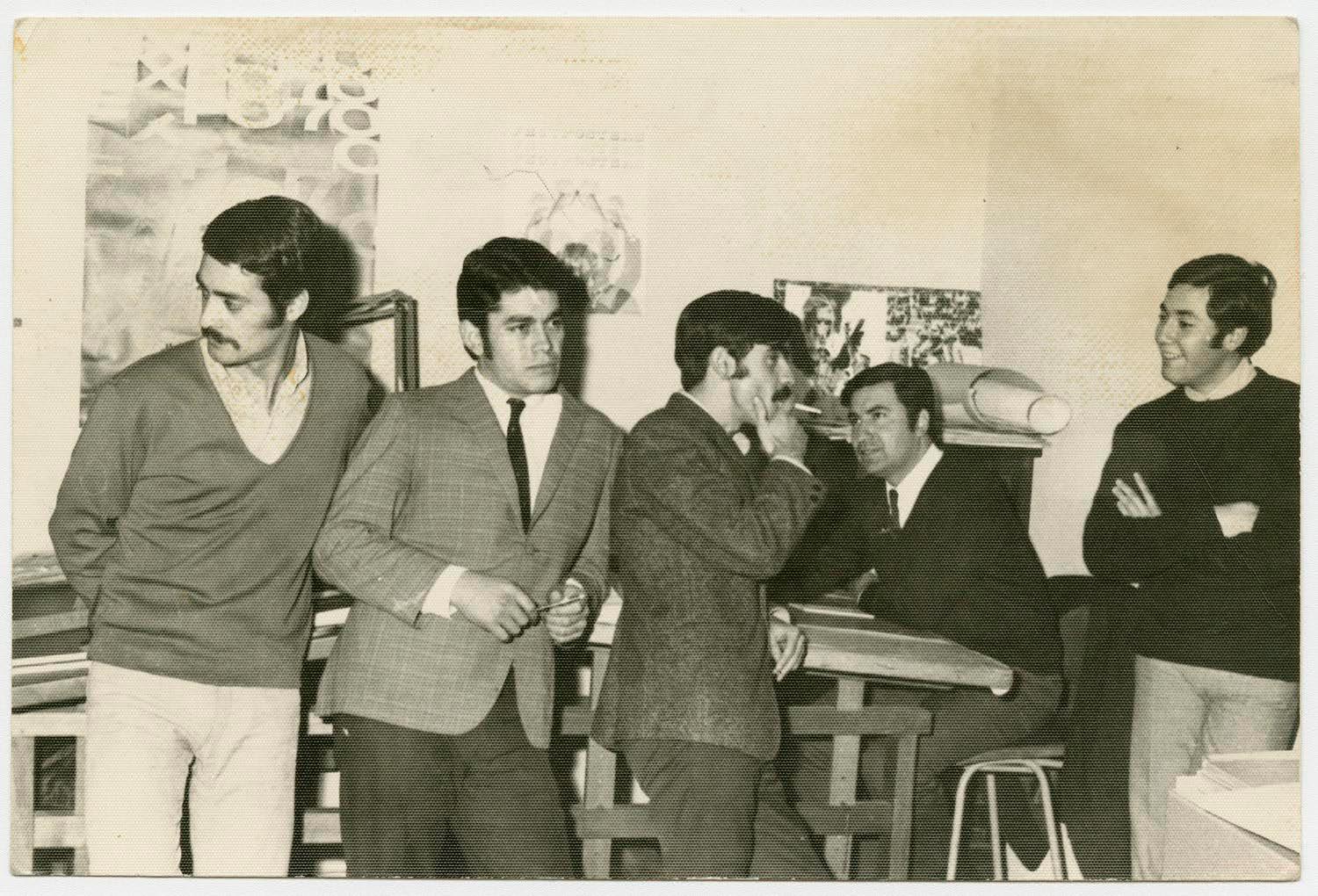 Diseñadores gráficos del Taller Gráfico UTE. De izquierda a derecha: Enrique Muñoz Abarca, Ricardo Ubilla Vera, Pablo Carvajal Gnecco, Mario Navarro Cortés y el montajista Carlos Acuña Álvarez.
