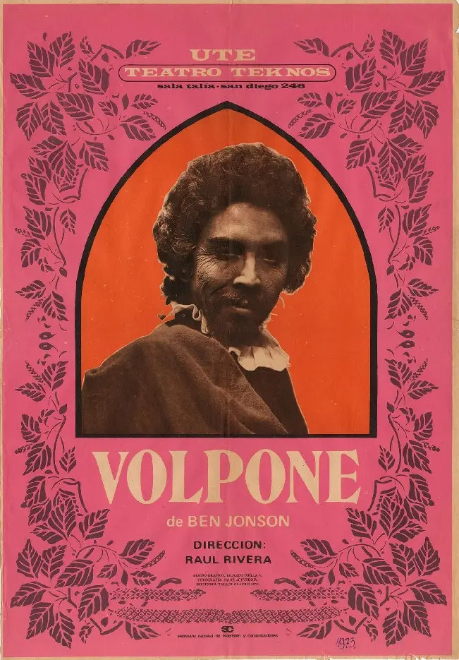 Afiche promocional de "Volpone", obra de Ben Jonson. Diseño por Ricardo Ubilla Vera y Fotografía por Jaime Acevedo Rocha. La obra fue estrenada por el Teatro Teknos en 1973 en la Sala Talía. Integraron el elenco Adriano Castillo como protagonista, Sonia Viveros, Fernando Boudon, Patricio Villanueva, Jorge Boudon, Juan Quezada, Gladys del Río, Gabriela Medina, Martín Andrade, Osvaldo Lagos y Maité Fernández.