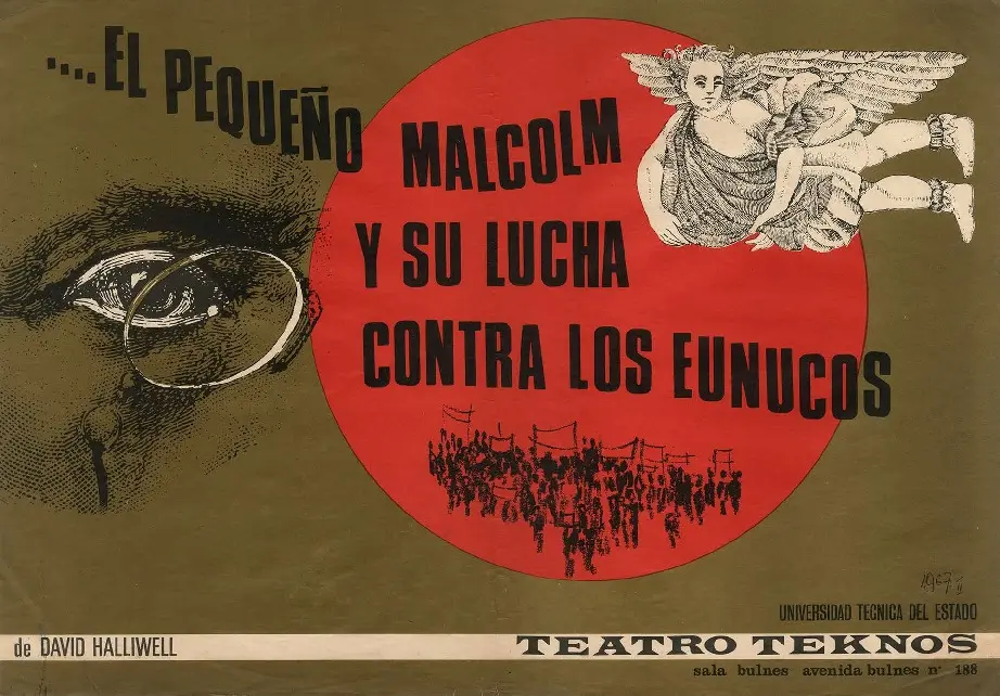 Afiche promocional de la obra "El pequeño Malcolm y su lucha contra los eunucos" del dramaturgo inglés David Halliwell, diseñado por Elías Greibe Bachur. Bajo la dirección de Raúl Rivera, la obra fue estrenada por el Teatro Teknos en la Sala Bulnes en 1967.