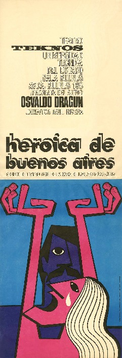 Afiche de la obra "Heroica de Buenos Aires" llevada a escena por el Teatro Teknos bajo la dirección de Raúl Rivera. Este montaje fue presentado junto a otras dos obras en el Festival de Teatro de Manizales, Colombia y luego en una gira hacia Panamá en 1970. Teknos fue un teatro de origen universitario, creado por los propios estudiantes en 1958. Desde 1968 hasta 1973 experimentó un periodo de madurez que los llevó a realizar giras a nivel nacional e internacional.