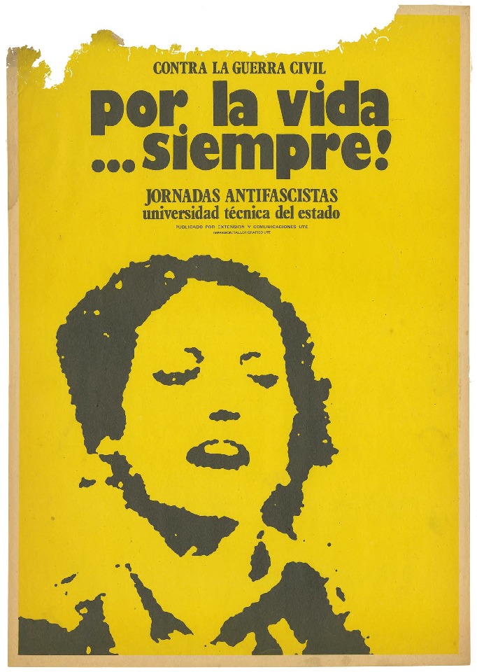 Serie de 18 afiches de la exposición “Por la vida… ¡siempre!”, una campaña comunicacional realizada, en 1973 por el Departamento de Comunicaciones de la Secretaría Nacional de Extensión y Comunicaciones, en el marco de las Jornadas Antifascistas de la UTE. Un rasgo relevante de esta campaña fue su exposición simultánea en diferentes sedes e institutos de la UTE, con el afán de que pudiera difundirse a lo largo del país. Los carteles exponían de manera didáctica las principales ideas que defendía el fascismo y las fatales consecuencias que podían traer para el proceso de democratización que estaba llevando a cabo el gobierno de la Unidad Popular. La exposición se inauguraría el 11 de septiembre con la presencia del presidente Salvador Allende; sin embargo, tanto la ceremonia como el proyecto comunicacional que la secretaría estaba desarrollando, fueron truncados por el golpe de Estado acontecido ese día, ya que la universidad fue brutalmente atacada el día 12 de septiembre de 1973 y la exposición fue destruída.