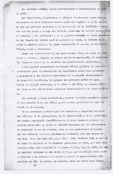 Texto de apoyo a la candidatura presidencial de 1952 al doctor Salvador Allende Gossens